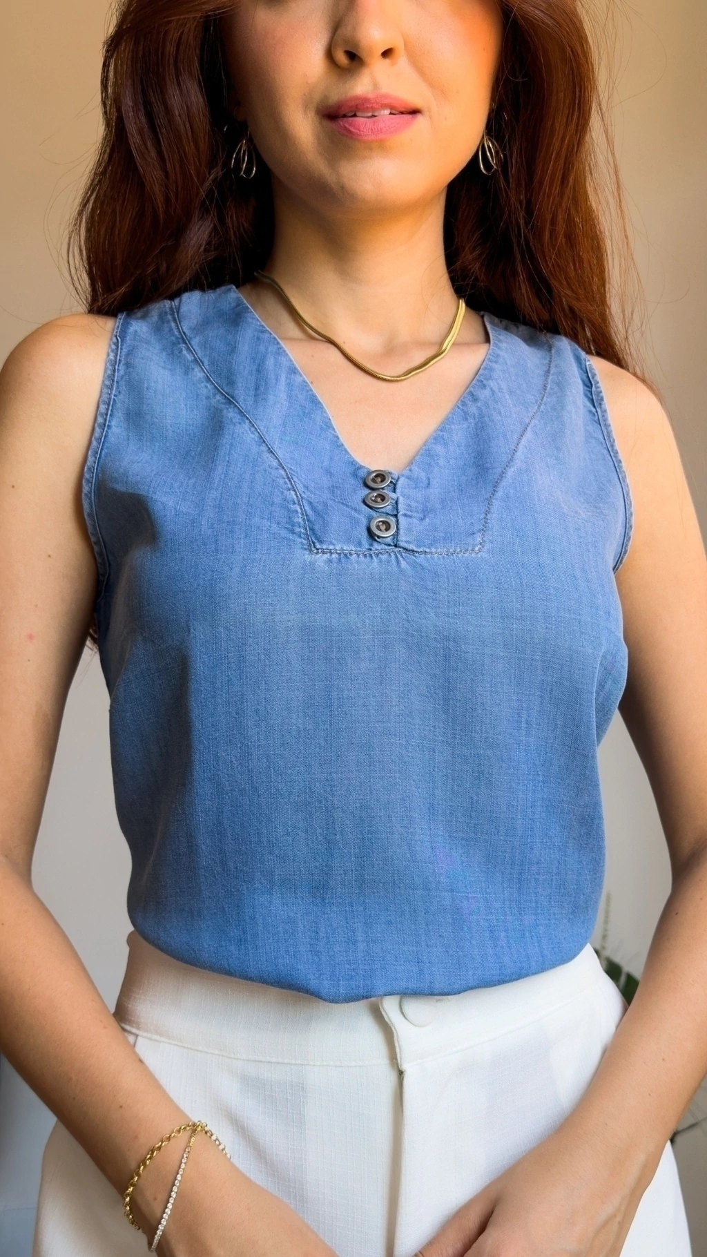 REGATA FEMININA JEANS COM BOTÕES NO DECOTE
